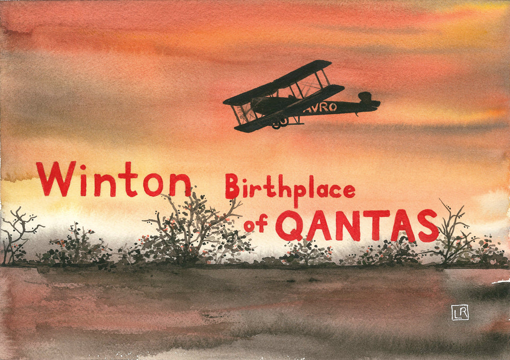 This print entitled 'Winton - Birthplace of QANTAS' is an authentic Giclee Reproduction of an original painted by Lindy Rixon in 2024. The reproduction was printed in the Print Studio at Big Vision & Print, New South Wales.