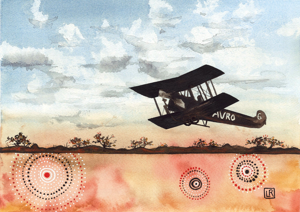 This print entitled 'QANTAS AVRO flies over Western Queensland' is an authentic Giclee Reproduction of an original painted by Lindy Rixon in 2024. The reproduction was printed in the Print Studio at Big Vision & Print, New South Wales.